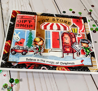 To create my card, first I cut the basic layers using the A2 Stitched Layers Card Toppers Die Set from the City Sidewalks 6x6 Paper Pad. I then cut the top layer from plain white watercolor paper. Next I ink blended the Hybrid Inks onto the layered sections of the Christmas on Main Street 2 Pack Stencil Set to create my city scene. To finish I colored the super Adorable kids from the City Sidewalks Stamps and added them the front of my card with foam tape for some added dimension.