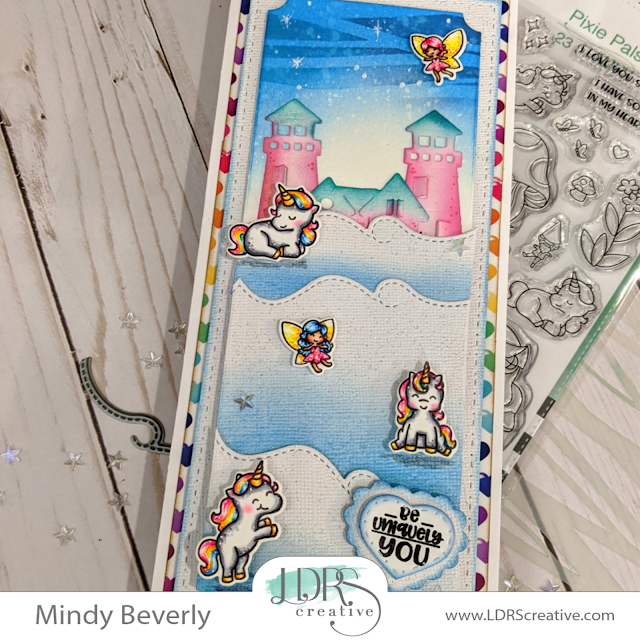 To complete my cloud scene I stamped and colored the Beautiful Unicorns and Fairies from this set with Alcohol Markers and added them to the front of my card with foam squares for some added dimension.