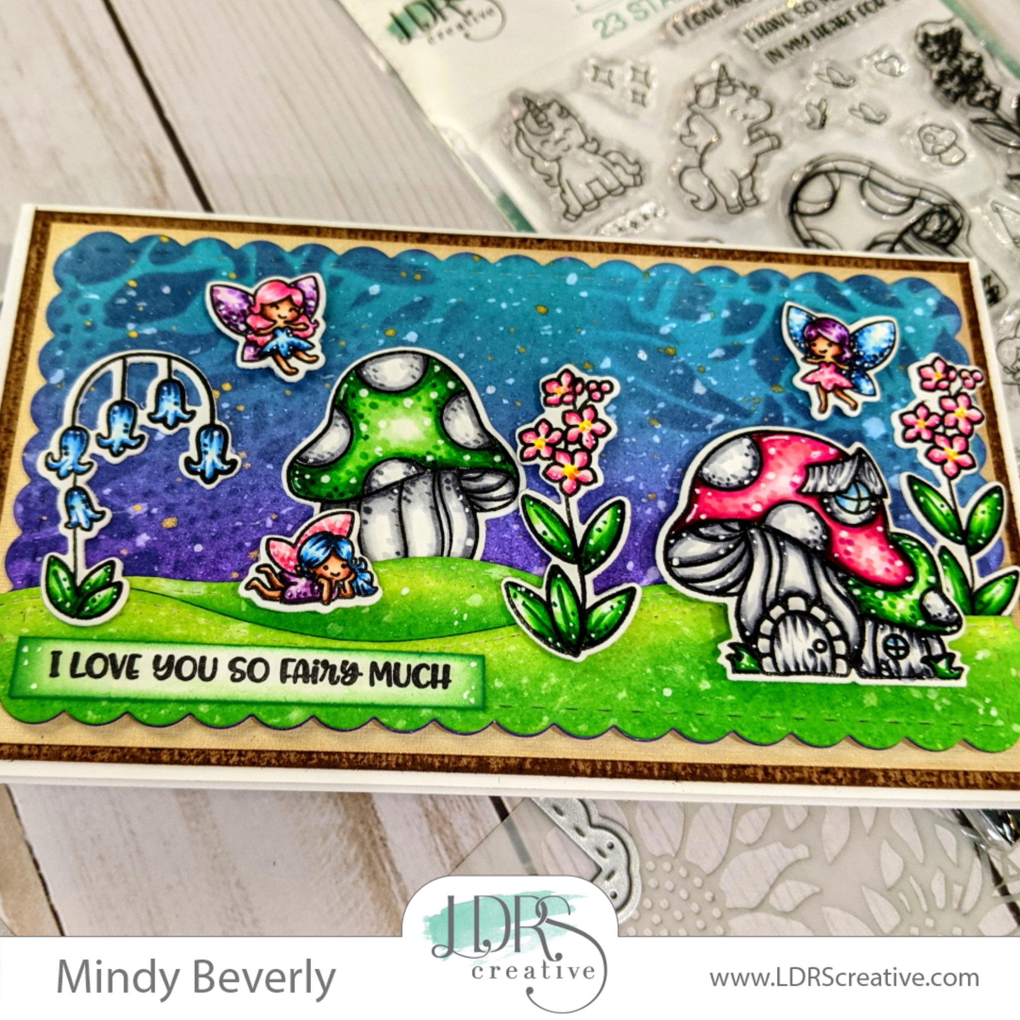 For my card I am showcasing the Absolutely Gorgeous Pixie Pals Pocket Pals Stamps, Pixie Pals Pocket Pals Outline Dies , and the Sunflower 6x6 Stencil. I just Love how versatile the stamps, dies, stencils, and inks are from LDRS Creative, and how they can be used for so many different occasions and projects. Now here is what I created: