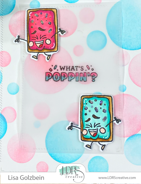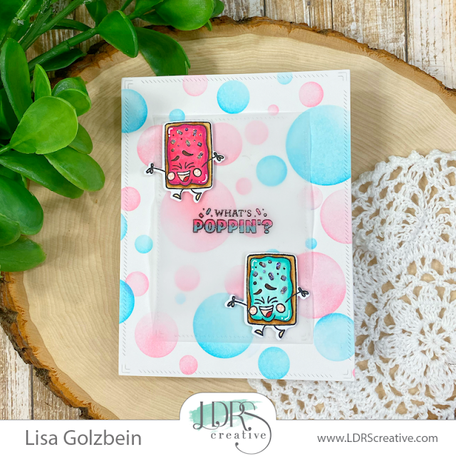 The last step was to stamp my Pop Tarts and sentiment and color them in to match the circles in the background. I used foam tape to pop up the vellum panel being careful to hide the tape behind the die cuts.