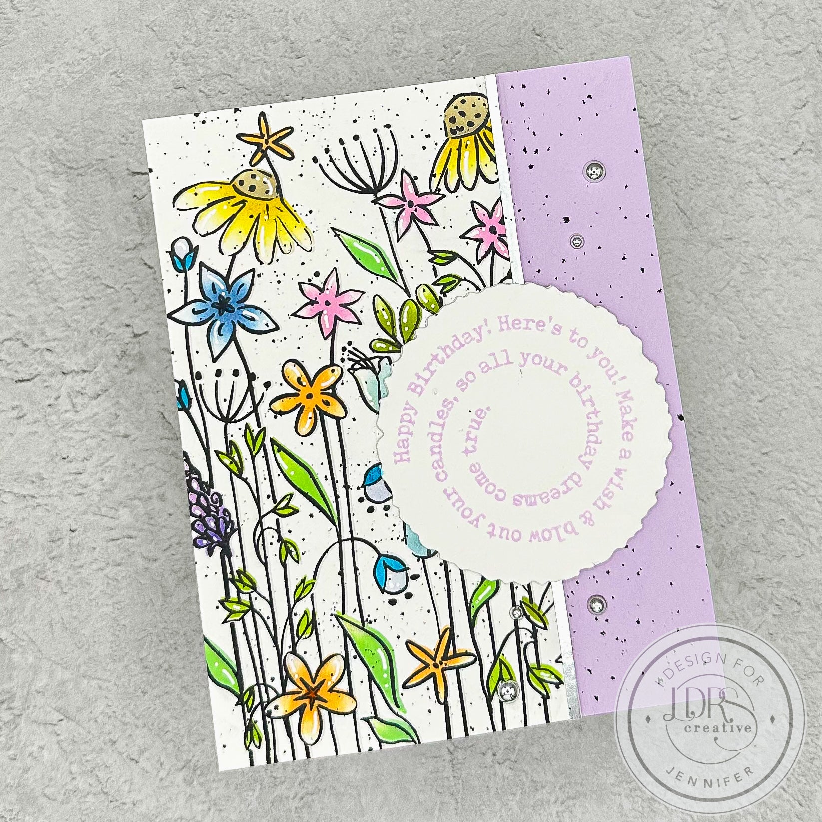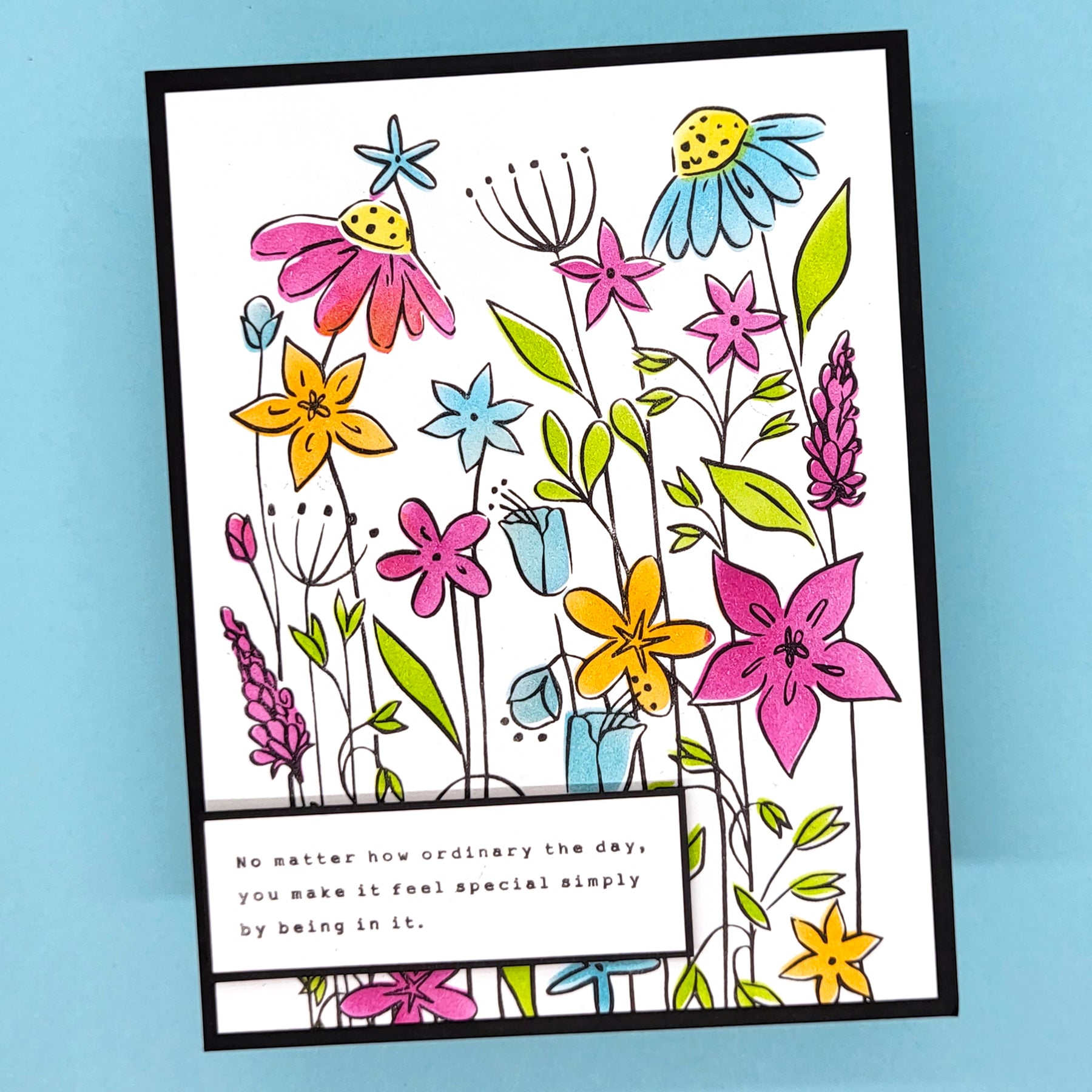 In today’s tutorial, Lynnea showcases the versatility of the Never-Ending Wildflowers Stamps and Layering Stencils. She demonstrates how to “stretch” a single stamp design by repeatedly stamping it across the card front to create a seamless, never-ending floral border.