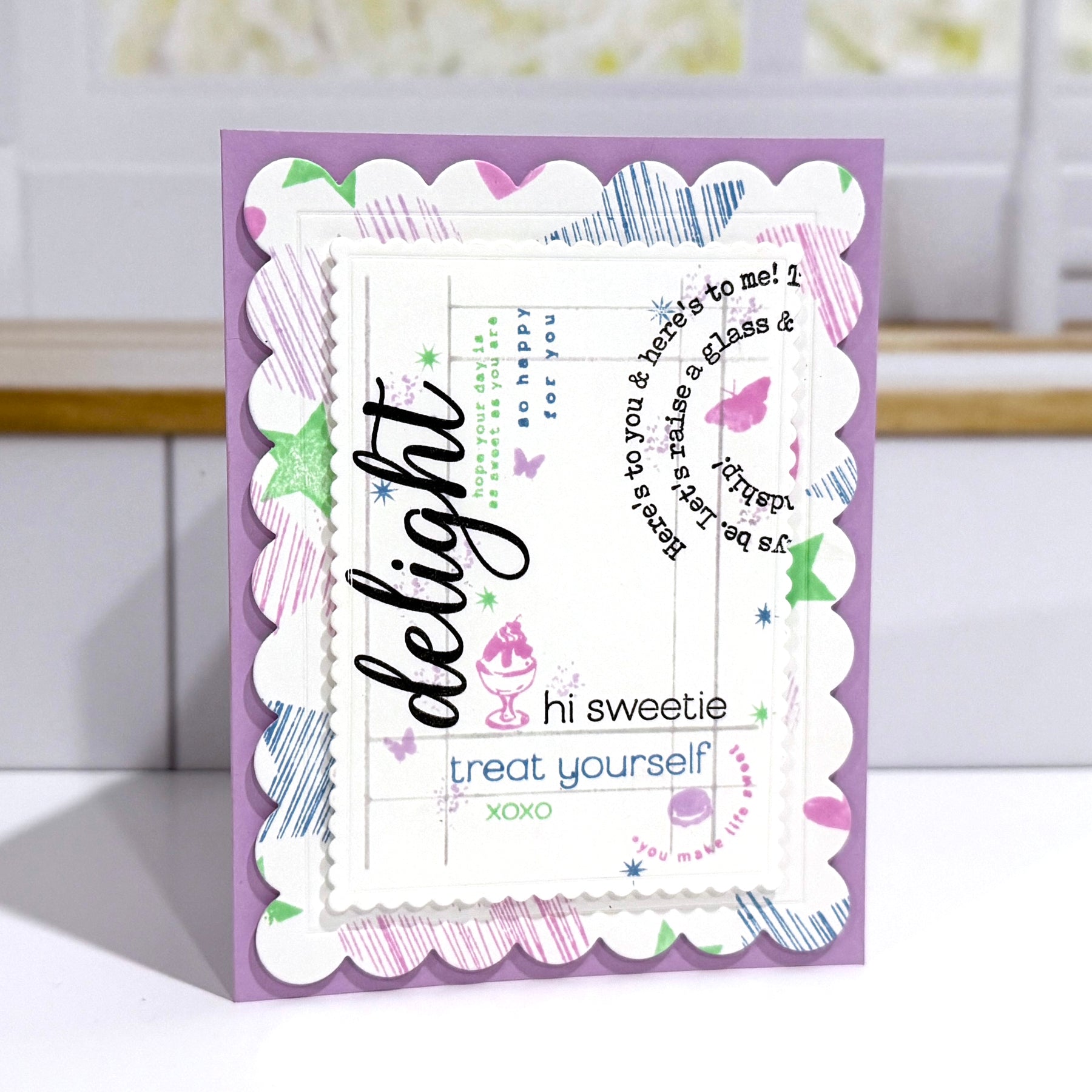 This design is easy peasy, perfect for quick cardmaking and easy mailing, but still packs a punch with layered stamping, texture, and contrast. Lynnea chose shades of purple with pops of black, but this card is totally color-customizable - pick any color under the rainbow and make it your own!